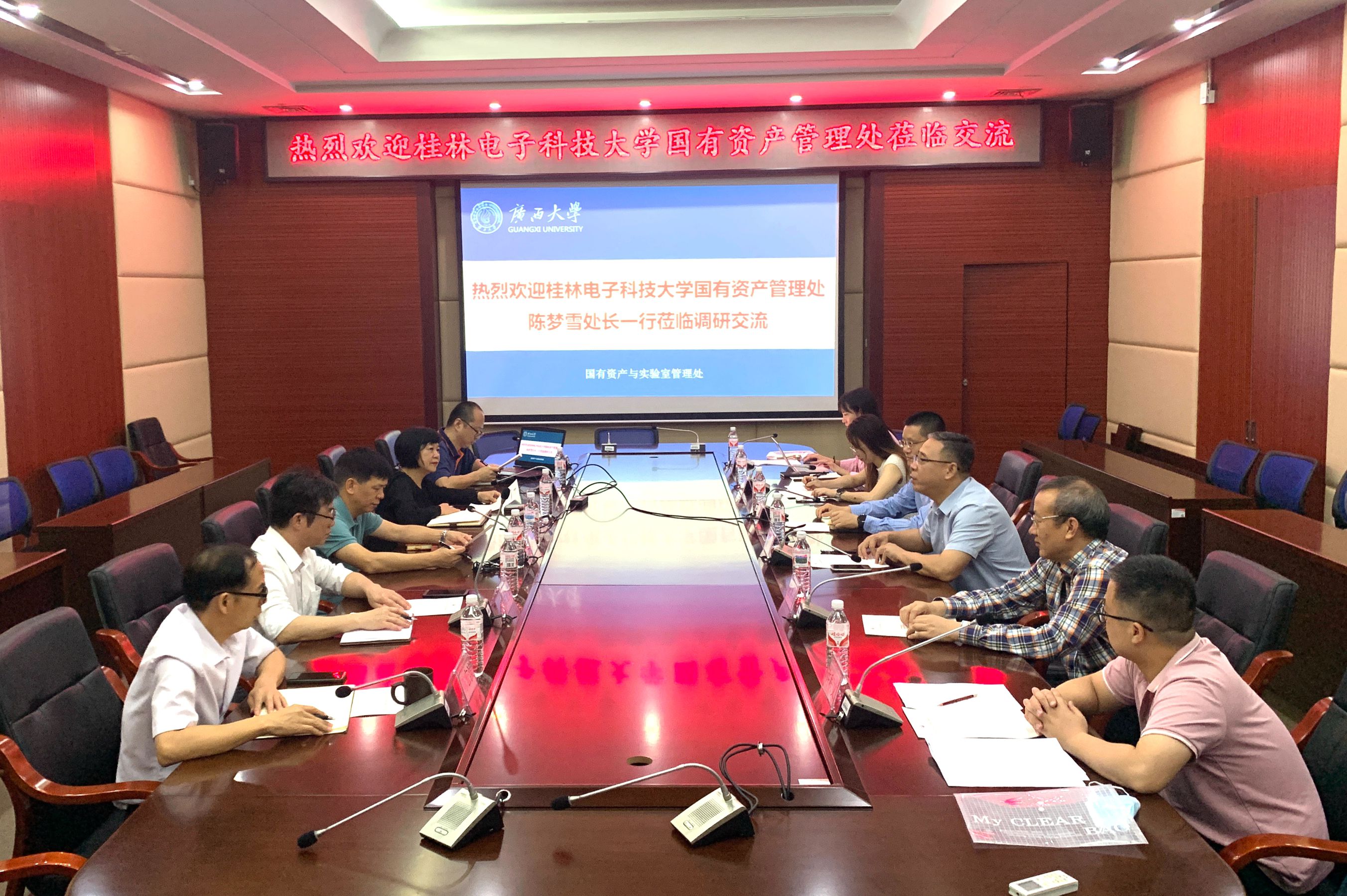 2022年10月28日上午,桂林电子科技大学国有资产管理处陈梦雪处长一行6人来校调研交流。廖小平处长、陈志武副处长、甘正华副处长及资产管理岗和大仪管理岗的负责同志参加交流座谈。
