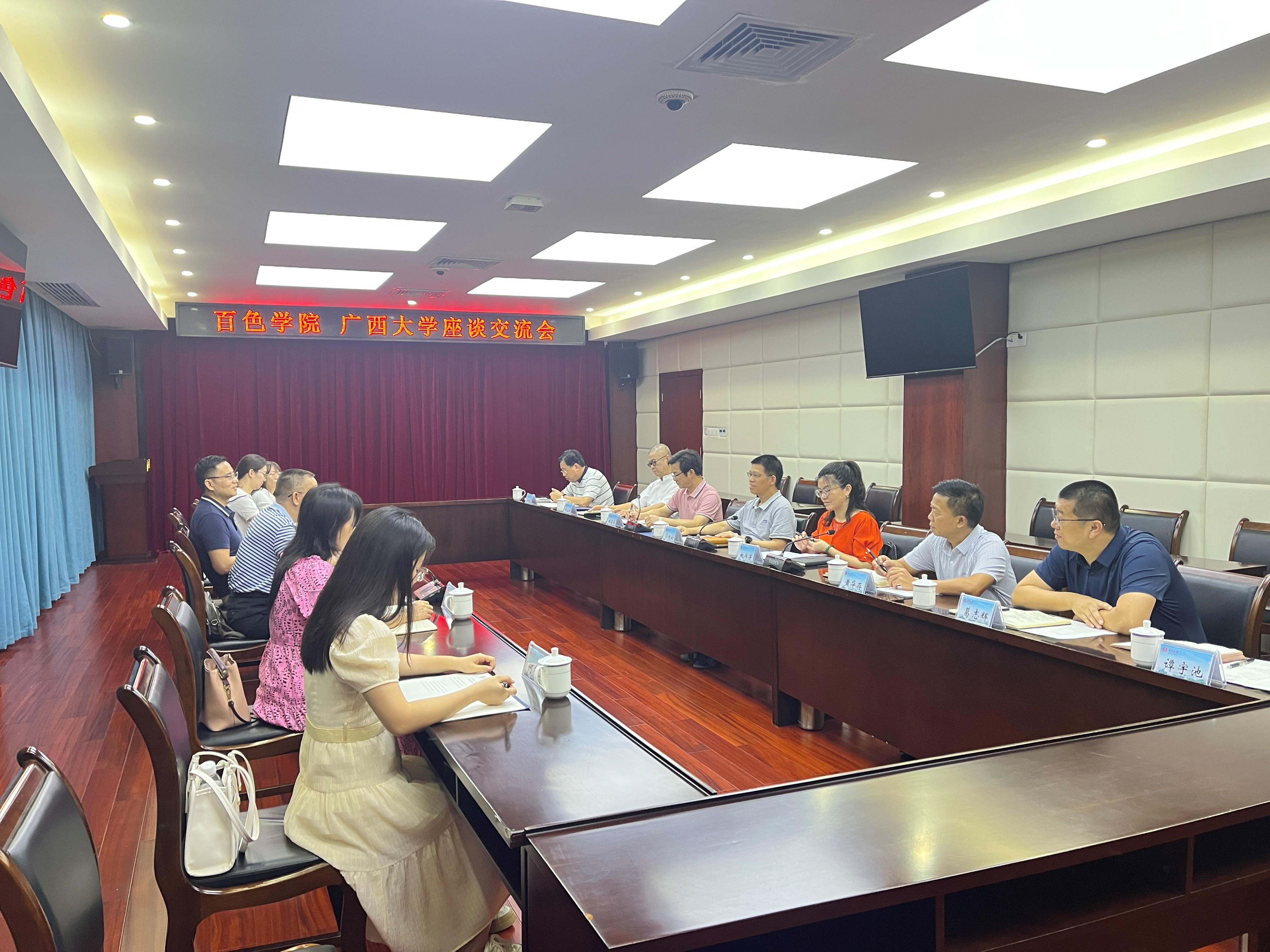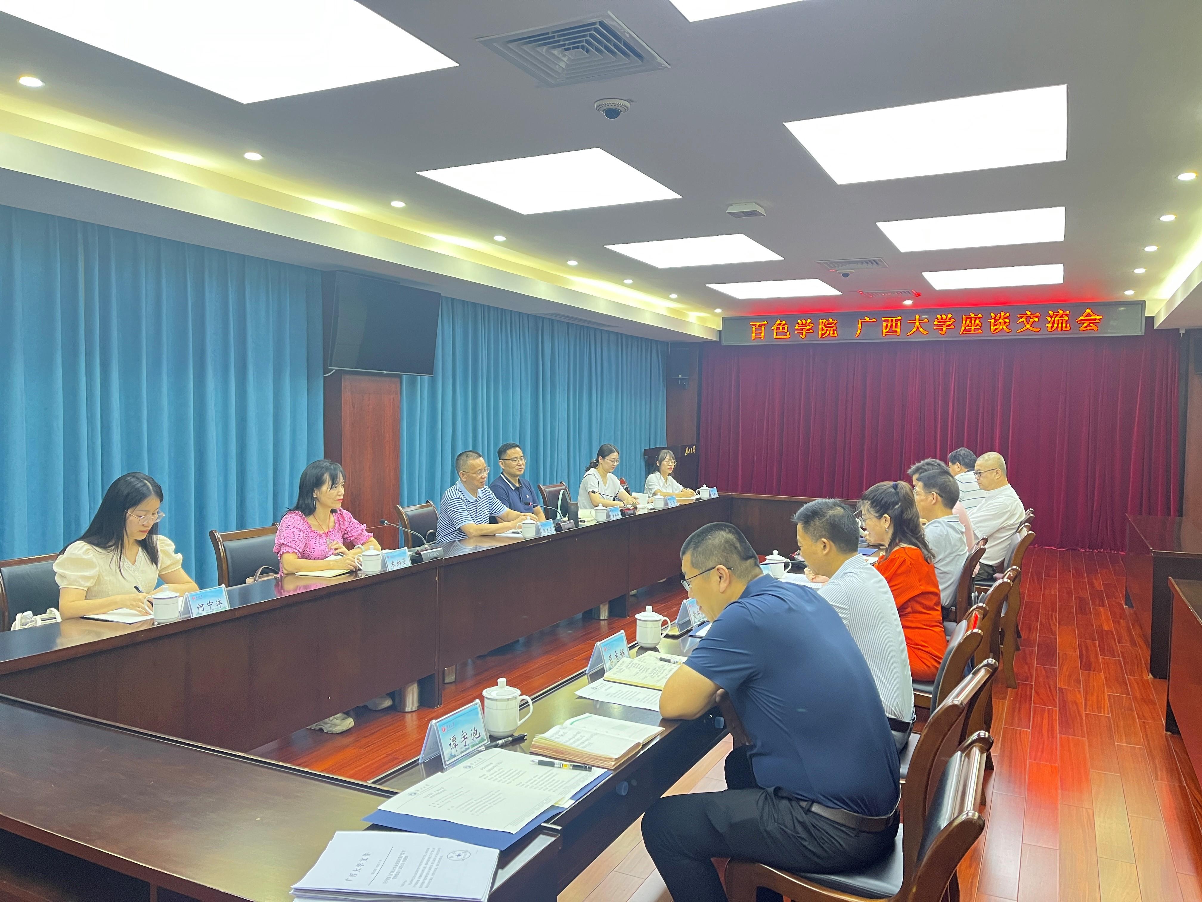 2023年7月18日下午,百色学院校党委常委、副校长廖志华一行6人到太阳集团2138网址就资产管理等工作开展调研交流。校党委常委、副校长宁旭初出席座谈会并主持会议。